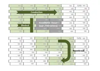 Some argue that the main reason these arrhythmias arise is due to abnormally slow electrical conduction in areas of the heart, specifically the right ventricle. The genetic variants associated with BrS support the concept as SCN5A, the gene most commonly associated with the condition, along with SCN10A, SCN1B, SCN2B and SCN3B, all directly affect the sodium current INa. The sodium current is a major contributor to the characteristic flow of electrical charge across the membrane of heart muscle cells that occurs with each heartbeat known as the action potential. INa causes the initial rapid upstroke of the action potential (phase 0), and decreasing the early peak current, as occurs in BrS-associated genetic variants, leads to slowing of the electrical conduction through the heart muscle.[8] This slow conduction allows 'short circuits' to form, blocking the waves of electrical activity in some areas while allowing the waves to pass in others in a phenomenon known as wavebreak. Given the right circumstances, this wavebreak can allow the waves of electricity to perform a U-turn within the muscle, travelling in the reverse direction before beginning to rapidly circle around a point, referred to as re-entry, and causing an abnormal heart rhythm.[8] Those who support this view (known as the depolarisation hypothesis) argue that conduction slowing may explain why arrhythmias in those with Brugada syndrome tend to occur in middle age, when other factors such as scarring or fibrosis that accompany old age have exacerbated the tendency to conduction slowing caused by the genetic mutation.[32]