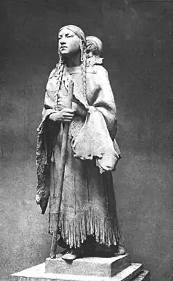 Zimm was commissioned to create a statue of Sacagawea for the 1904 World's Fair. His research into her turned up new evidence: "A sculptor, Mr. Bruno Zimm, seeking a model for a statue of Sacagawea that was later erected at the Louisiana Purchase Exposition in St. Louis, discovered a record of the pilot-woman's death in 1884 (when ninety-five years old) on the Shoshone Reservation, Wyoming, and her wind-swept grave."[5] Zimm also created the colossal Allegorical Figure of North Dakota for the Fair, one of fourteen seated sculptures representing the U.S. states that had been part of the Louisiana Purchase. In addition, he created architectural sculptures for some of the buildings.