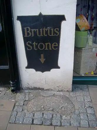 Geoffrey's Historia says that Brutus and his followers landed at Totnes in Devon. A stone on Fore Street in Totnes, known as the "Brutus Stone", commemorates this imaginary event.[15]