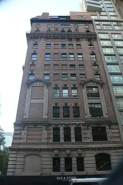 The facade is made of pink brick, stone, and terracotta.[3][17] When the Bryant Park Studios were built, the facade was visible on all sides, though subsequent development obscured the south and east elevations.[18] The north elevation facing 40th Street, as well as the west elevation on Sixth Avenue, remain visible and are both divided into three horizontal sections: a base, midsection, and upper section.[10][19] The 40th Street elevation is divided vertically into five bays.[16] The building has wide studio windows on 40th Street, which generally measure 12 by 12 feet (3.7 by 3.7 m).[20] The Sixth Avenue elevation is generally arranged as a central bay flanked by two end bays.[21]