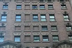 The fourth through eighth stories are clad with pink brick and have terracotta and stone ornamentation.[19] On the 40th Street elevation, most windows are full-height; the center bay has two narrow windows, while the remaining bays have a large studio window. All bays, except the center one, have a balcony at the fourth story. The outermost bays are flanked by continuous brick piers from the fourth to eighth stories, with a volute above the sixth story and a balcony at the seventh.[16] The three middle bays are arranged differently. At the fourth and fifth stories, the center bay's windows are topped by volutes, and the second-outermost bays have double-height stone frames topped by pediments. At the sixth through eighth stories, the three middle bays have full-height recessed windows, each with volutes and splayed lintels above them. A window sill connects the three middle bays at the sixth story.[22] On the eighth story, all openings contain segmental arches.[21]