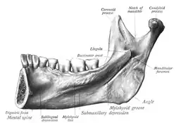 The buccinator crest (Latin crista buccinatoria) is a bony crest of the human mandible, that passes from the base of the coronoid process to the area of the third molar.[1] The alveolar border of the buccinator muscle attaches upon it.[2]