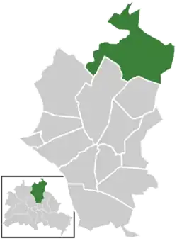 Along its border with the state of Brandenburg, Buch is surrounded by the municipalities of Wandlitz and Panketal (with the civil parishes of Zepernick, Röntgental and Neu Buch[3]), both in the district of Barnim. The Berlin localities bordering with Buch in the south are Blankenfelde, Französisch Buchholz and Karow. In Karow, a neighbourhood exists which is named Stadtrandsiedlung Buch.