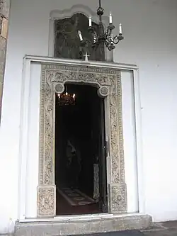 The entrance is made through a similarly elegant porch, similar to those found in peasant houses in Romania, supported by wooden posts. Above, the building has a cupola with a mushroom-shaped roof. The windows and doors are ornamented with carved stone, added at the beginning of the 20th century.