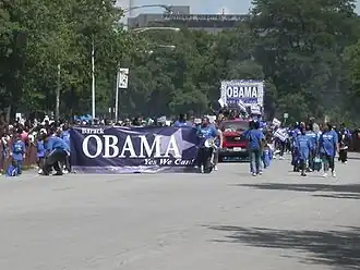 At the 78th annual parade in 2007, then–U.S. Senator Barack Obama served as the Grand Marshal for the second year in a row.[90] Chicago Mayor Richard M. Daley attended, and march participants included U.S. Senator Dick Durbin, Lieutenant Governor of Illinois Pat Quinn and the Rev. Al Sharpton.[91] One float represented the Chicago 2016 Committee and included past Chicago Olympians Bob Pickens, Willie May, Diane Simpson-Bundy and Kenny Johnson as well as the son of Danell Nicholson. The Chicago Bulls' mascot made a guest appearance.[86]