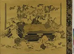 The Japanese deva Kangiten, a Buddhicized form of the Hindu god Ganesha, was considered sexually symbolic, being represented as dual figures embracing.[7] It received a wide worship, especially among geishas and people in the business of pleasure, and its esoteric sexuality meant its image had to be usually covered from public eyes.[8] The 12th century saw the rise of the infamous Tachikawa-ryu sect, an extreme tantric sex school where human skulls and emission of sexual fluids were used in ritual, for which they were later persecuted and suppressed by mainstream Buddhists.[9] Finally, even in non-tantric Buddhism, influential 15th century monk Ikkyu preached for sex and love as valid ways to reach Enlightenment. He is variously considered a heretic or a saint within Zen.[10]