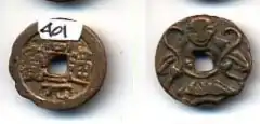 Zhouyuan Tongbao (Traditional Chinese: 周元通寶; Vietnamese: Châu Nguyên Thông Bảo) charms are a common category of Chinese and Vietnamese Buddhist coin charms that are based on cash coins were issued by Emperor Shi Zong from the year 955 onwards. The pattern is also based on the Kai Yuan coin. They were cast from melted-down bronze statues from Buddhist temples.[29] When reproached for this, the Emperor uttered a cryptic remark to the effect that the Buddha would not mind this sacrifice.[29] It is said that the Emperor himself supervised the casting at the many large furnaces at the back of the palace.[29] The coins have amuletic properties because they were made from Buddhist statues, and are particularly effective in midwifery – hence the many later-made imitations.[29][30]