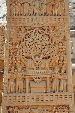 One of the “three knowledges” (tevijjā) of the Buddha was recollecting past lives. However, early texts contain very few actual narratives of past lives.[23] Such stories as are found in the early texts almost always show signs of belonging to the latest strata of those texts.[24] However, in a short time the Buddhist community developed a vast repertoire of stories associated with the Buddha's past lives, known as the Jātakas. There are 550 such stories in the Pali canon, and hundreds more in Chinese, Tibetan, and Sanskrit sources. Several Jātakas are depicted in visual form on the monuments at Sanchi, dating around the 1st century BCE. The corpus of Jātaka stories continued to grow over the centuries. Some of the most popular continue to be the Mahanipata Jataka which depict the final ten lives of the Buddha before his last birth.