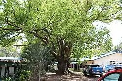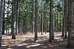 In addition to the ongoing improvements being undertaken throughout the Buderim district by the BWMCC, in July 1946 a proposal for the establishment of an "arboretum" was adopted. It was hoped that "the laying of an arboretum planted with suitable trees ... will add beauty to an already fine natural setting".[57] In December of that year this came to fruition, with the planting of a further 600 trees, comprising 10 species, in the reserve beside the sports ground and the recently planted pine forestry plot at the school. The Buderim War Memorial Arboretum was planted by a large number of community members, including 50 children from the school, and would "serve to perpetuate the memory of those who served in the last two wars".[58] The pine forest was included as part of the war memorial.[1]