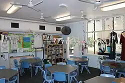In 1959 another classroom building, Block C, was constructed. Highset on concrete posts, it was a timber-framed and weatherboard-clad building with an 8-foot (2.4 m) wide verandah on the north side used as circulation to a single, south-facing classroom 21 by 24 feet (6.4 m × 7.3 m). The earlier buildings on the site had been built parallel to the site boundaries but Block C disregarded this and was built at an angle to face directly north, which was characteristic of the standard type.[63] Designed by the Department of Public Works, the type (High Set Timber Building with Semi-enclosed Stair, F/T4) was introduced in c. 1950 and built into the 1960s. (Despite its name, the type did not always include a semi-enclosed stair.) This type was typically long buildings of multiple classrooms and it was planned for Block C to be extended on its eastern end with further classrooms but this did not occur.[64] Block C included typical variations of features introduced into later versions of the type - a bag-rack balustrade on the verandah and louvres in the verandah wall. In c. 1966 the original stair on the west side of Block C was removed and refixed on the northern side in a reconfigured L-shape with generous awning roof. In c. 1976 it was remodelled for administration use with partitions built to accommodate smaller offices. This work was reversed in c. 1986 with the partitions removed and the space reverting to a single classroom.[65][66][67][68] The understorey had a concrete floor and was used as semi-enclosed covered space with a perimeter bench seat. The southern and verandah walls were extensively glazed, providing abundant natural light and ventilation to the classroom.[1]