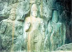 Buduruwagala is an ancient Buddhist temple in Sri Lanka. The complex consists of seven statues and belongs to the Mahayana school of thought. The statues date back to the 10th century. The gigantic Buddha statue still bears traces of its original stuccoed robe and a long streak of orange suggests it was once brightly painted. The central of the three figures to the Buddha's right is thought to be the Bodhisattva Avalokiteśvara. To the left of this white painted figure is a female figure in the thrice-bent posture, which is thought to be his consort-Tara.