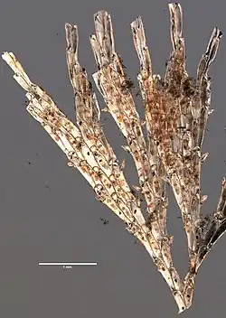 Bugulina flabellata is a colonial bryozoan forming small clumps up to 5 cm (2 in) high with a characteristic cone or fan-shape. The fronds have up to eight dichotomous branches with square tips. Each zooid bears two or three short spines. Colonies are dark buff when living and greyish when dried up.[2]