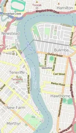 Bulimba Reach flows from south (upstream) to north (downstream). The suburbs of Hawthorne and Bulimba are on its eastern bank. The suburbs of New Farm, Teneriffe and Newstead lie to the west. Breakfast Creek joins the Brisbane River from the north-east at the northern end of Bulimba Reach.[2]