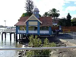 The terminal's waiting shed is an open timber-framed structure clad in weatherboard and has a gabled roof with terracotta tiles. At the intersection of the roof gables is a short octagonal tower with four clock faces, topped by a metal cupola.[5]