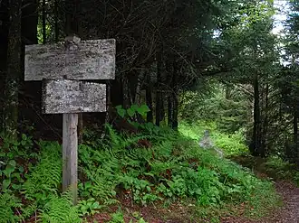 The partition of the Bullhead and Rainbow Falls trails, two-thirds of a mile below the LeConte Lodge, showcasing Bullhead. | |