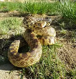 Adult bullsnakes average about 4 to 6 ft (1.2 to 1.8 m) in length, and specimens of up to 8 ft 4 in (2.5 m) have been recorded.[7] The maximum record for the species is 110 in. (279 cm.).[4] Possibly being the largest subspecies of gopher snake on average, mature specimens can have an average weight in the range of 1–1.5 kg (2.2–3.3 lb), though the heavier known specimens can attain 3.6–4.5 kg (7.9–9.9 lb), with larger specimens being quite bulky for a colubrid snake.[8][9][10][11] This makes bullsnakes among the largest snakes native to Canada and the United States, although they are generally not as long as indigo snakes nor as heavy or as large in diameter as rattlesnakes. They are usually yellow, with brown, white, black, or sometimes reddish blotching. The blotching pattern is large blotches on top, three sets of spots on the sides, and bands of black on the tail. Many color variations have been found, including albinos and white varieties. A scale count is required to distinguish juvenile bullsnakes from other juvenile gopher snakes.[12]