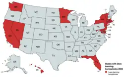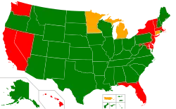 Prior to the federal ban effective March 26, 2019, some states had taken action on their own to restrict ownership of the accessory. Since 1990, the sale of bump stocks has been illegal in California. They were banned in New York with the passage of the NY SAFE Act in 2013, and more explicitly banned in early 2019.[41] The device's legal status is unclear in Connecticut, Michigan, Minnesota, and Puerto Rico.[42]