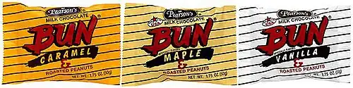 Bun Bars have one of three flavored centers (maple, vanilla, or sea salt caramel) covered in unsalted peanuts and milk chocolate. When first bought by Pearson's in 1998, maple and vanilla flavors were available, and later caramel was added to the line-up.[10] In 2015, the caramel flavor was changed to sea salt caramel.