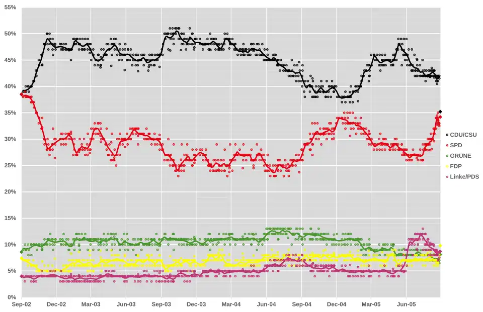 | Emnid | 9–12 Sep 2005 | ~2,000 | 33.5 | 42.0 | 7.0 | 6.5 | 8.0 | 3.0 | 8.5 |