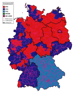The 2005 German federal election was held in Germany on 18 September 2005 to elect the members of the 16th Bundestag. The snap election was called after the government's defeat in the North Rhine-Westphalia state election, which caused them to intentionally lose a motion of confidence to trigger an early federal election. The outgoing government was a coalition of the centre-left Social Democratic Party of Germany (SPD) and Alliance 90/The Greens, led by federal chancellor Gerhard Schröder. The election was originally intended for the autumn of 2006.[1][2]
