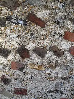 Bungaroosh (also spelt bungeroosh and other variations[1][2]) is a composite building material used almost exclusively in the English seaside resort of Brighton, the neighbouring town of Hove and in the coastal Sussex area. The etymology of the word is unknown.[2] Its use dates from the start of the Regency period at the end of the 18th century, and into the 19th when Brighton grew from a fishing village into a large town.[3] Bungaroosh is often found in buildings of that era in the town and in its near neighbours Worthing and Lewes[4] but is little known elsewhere except London.[3] It was a building material first introduced by the Romans and has characteristics of that era.[3][4] It can incorporate any of a wide variety of substances and materials and is used most often in external walls.[1][5]
