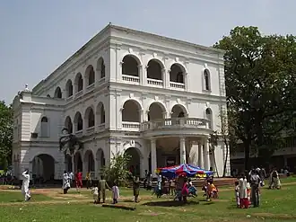 Burdwan House was built in 1906 during the British colonial period.[1] After the partition of Bengal in 1905 and Dhaka's elevation to the status of the provincial capital, construction began for residences and offices for high-ranking domestic and foreign government officials along with Old High Court Building, Curzon Hall and others. The building was then two storeys, with staff quarters behind it. In 1911 the partition of Bengal was annulled and Dhaka lost its status as provincial capital. To address the dissatisfaction of the influential Muslim leaders of East Bengal, especially the Nawabs of Dhaka, British government established the University of Dhaka and arranged for the Governor's three executive council members to hold a meeting in Dhaka once a year.[1] To accommodate the three visiting Council members, the government constructed there official residences. Among these, Burdwan house was, according to some sources, built in 1911[2] for Maharaja of Burdwan. Until 1947, Burdwan House was mainly used as a guest house for high-ranking government officials. From 1919 to 1924, Maharaja Sir Bijay Chand Mahtab of Burdwan as one of the members of the Governor's Executive Council of Bengal visited Dhaka annually and stayed in this house as a royal guest.[1][2]