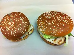 While McDonald's had been trying to develop and test a similar product for several years,[37] the company was caught off guard at the time when its mainline competitors introduced their grilled chicken products and was not able to initially deploy a similar product. This was primarily due to the fact the company's highly specialized kitchens could not produce a high quality product without a large investment in new equipment.[32] By early 1991, McDonald's grilled chicken product was still in development,[38] and the vendor would not introduce its version, the McGrilled Chicken Classic, until 1994.[39] The McGrilled chicken burger was replaced with the Grilled Chicken Deluxe burger in September and October 1996 as part of McDonald's Deluxe line of "upscale" burgers; the company had hoped that a higher value product would help improve average check performance at its stores.[40] However, by 1998 the whole Deluxe line was said to be not selling well,[39] and the Grilled Chicken Deluxe was eliminated when McDonald's brought back the Chicken McGrill burger back in 1999.[41] The Chicken McGrill burger was retired in 2005 when the company introduced its new Premium line of products, which like the TenderCrisp burger was targeted to a more adult audience with higher quality ingredients such as natural cheeses and whole leaf lettuce.[42] Beginning in April 2015, McDonald's moved to a new grilled chicken burger, the Artisan Grilled Chicken; the new chicken uses a smaller list of ingredients in the chicken filet, removing ingredients such as maltodextrin and sodium phosphates. The new burger is in response to consumer-based market trends of food products that have simpler, more natural ingredients.[43]