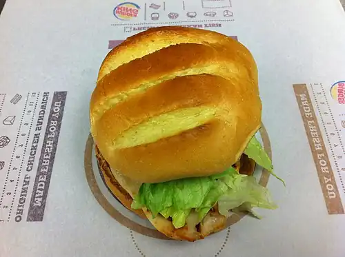 As part of the forty-fifth anniversary of its Whopper burger in 2002, BK introduced an updated version of the burger called the Chicken Whopper and added a smaller version called the Chicken Whopper Jr. burger, along with a new Caesar salad burger topped with a Chicken Whopper filet.[13][14][15] The introduction of the Chicken Whopper represented the company's first move to extend the Whopper brand name beyond beef-based burgers since the original Whopper's introduction in the 1950s.[16] The burgers featured a whole chicken breast filet, weighing either 4.7 oz (130 g) for the larger burger and a 3.1 oz (88 g) for the Jr., mayonnaise, lettuce, and tomato on a sesame seed roll.[17] A newly reformulated low fat mayonnaise was introduced in conjunction with the new burgers.[18] Along with the company's new BK Veggie burger, The Chicken Whopper Jr. version of the burger was lauded by the Center for Science in the Public Interest as being one of the best nutritionally sound products sold by a fast food chain. Still, the CSPI decried the rest of the Burger King menu as being vastly unhealthy.[19]