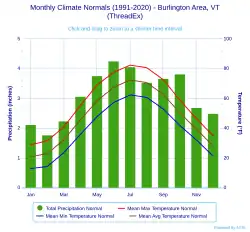 Burlington has a hot-summer humid continental climate (Köppen Dfa), with cold winters and warm to hot, humid summers. The monthly daily average temperatures range from 21 °F (−6.1 °C) in January to 72 °F (22.2 °C) in July. The annual precipitation of 43 inches (1,092 mm) is well-distributed throughout the year, but the summer months are the wettest. The city's location east of Lake Champlain sometimes accounts for localized snow squalls, producing up to 13 inches (33 cm) in 12 hours on rare occasions.[46] Annual snowfall averages 86 inches (218 cm), but this figure can fluctuate greatly from one year to another. Temperature extremes have ranged from −30 °F (−34 °C) on January 15, 1957, and February 12, 1979, to 101 °F (38 °C) on August 11, 1944.[47] The most recorded snowfall from a single storm is 33.1 inches (84.1 cm), which fell January 2–3, 2010.[48]
