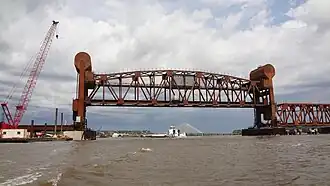 Following the passing of the American Recovery and Reinvestment Act of 2009, and a successful application for federal funding supported by the Coast Guard,[4] the BNSF Railway began work to replace the bridge in late 2009.[5] The project was split into two phases, with the lift span being built first by Ames Construction, of Burnsville, Minnesota, and the approach trusses built by the Walsh Construction Company of Chicago, Illinois. The lift span was complete and operational by February 2011, while the remainder of the bridge was not officially dedicated until October 2012.[6]