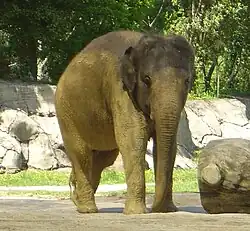 Burma came to Auckland Zoo in 1990.[3] She initially exhibited "teenage high jinks" with which Kashin, the other elephant in the enclosure, was reported to be impatient.[4] As she got older, these disappeared and the two elephants got along better.[4] Burma was trained to perform actions after being spoken to in Hindi. Hindi was chosen over English in order to prevent her from unintentionally carrying out potentially dangerous commands.[5]