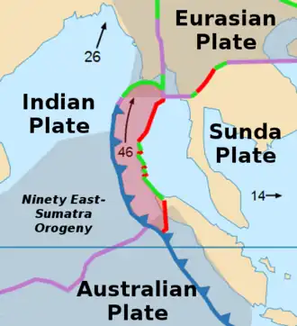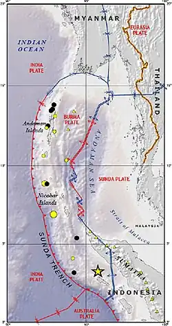 On December 26, 2004, a large portion of the boundary between the Burma plate and the Indian plate slipped, causing the 2004 Indian Ocean earthquake and tsunami.[3] This megathrust earthquake had an estimated moment magnitude of 9.1–9.3 Mw.[4] Over 1,600 kilometres (990 mi) of the boundary underwent thrust faulting and shifted up to 5 metres (16 ft) vertically and 11 metres (36 ft) horizontally.[4] This rapid rise in the sea floor over such a short time (seven minutes[4]) generated a massive tsunami that killed approximately 229,800 people along the coast of the Indian Ocean.