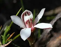 Burnettia cuneata, commonly known as the lizard orchid,[2] is the only species of the flowering plant genus Burnettia in the orchid family, Orchidaceae. It is a leafless terrestrial, mycotrophic herb with one or two leaf-like bracts and up to seven flowers that are brownish on the back and pink or white inside. It is endemic to southeastern Australia where it grows in dense thickets in swamps.