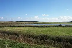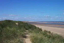 To the east of the Burnham Overy creek, the former salt marshes between dry land and the sand dunes have been reclaimed to form fresh water meadows, part of the Holkham estate. A one-and-a-half-mile (2.4 km) long footpath links Burnham Overy Staithe to the sand-dunes and beach, running along the crest of the embankment which protects these water meadows from the creek.[5]