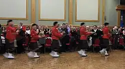A bagpiper sometimes greets the guests, who gather and mix as at any informal party.[11] At less formal gatherings, traditional Scottish music is played.[12]