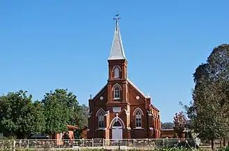 The town sits in an area that was termed Burrumbuttock station in 1839.[4] The Crown Lands Alienation Act (Robertson Land Act) of 1861 saw the arrival of settlers to the region.[4] By the 1870s, a large number of South Australian settlers of German origin came to Burrumbuttock.[4] Burrumbuttock Post Office opened on 1 May 1883.[5] A school, called Burrumbuttock East, was opened in 1889; the name was changed to Burrumbuttock Public School in 1929.[4] The origin of the name "Burrumbuttock" is unclear, but believed to be of indigenous (probably Wiradjuri) in origin because the word "Burrum" usually refers to water.[4] Locals claim that the name means "bullock's backbone", but there is no evidence for this name.[4]