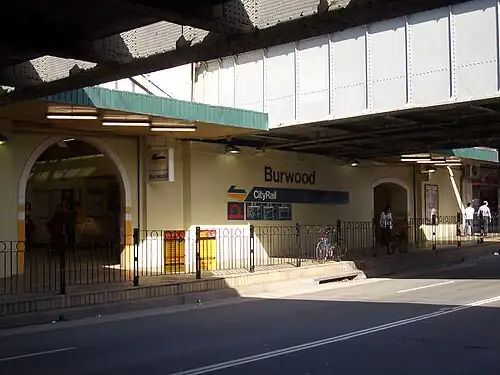 Entrance to Burwood Railway Station, situated between 2 of the bridge spans