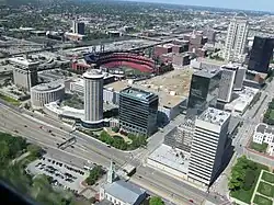 In 1995, St. Louis Cardinals team ownership began to lobby for a new ballpark in downtown St. Louis, but the team was unable to acquire funding for the project for several years. In June 2001, the Missouri state government signed a contract with the team, proposing a ballpark in downtown St. Louis, but a subsequent funding bill was struck down in May 2002, leaving the saga open.[21][22] Team owners sought a location near Madison, Illinois, adjacent to Gateway International Raceway, until the city of St. Louis drafted a financing plan for the team to construct the new stadium in downtown St. Louis.[23] The stadium was financed through private bonds, bank loans, a long-term loan from St. Louis County, and money from the team owners. The development, including the Ballpark Village was projected to cost approximately $665 million with the stadium alone costing $365 million.[12]