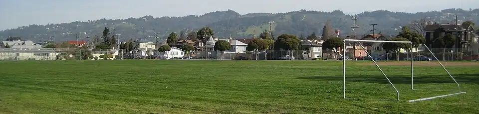 The park was established in 1903 through the donation of seven and a half acres of land[4] by Dr. Bushrod Washington James, a resident of Philadelphia, Pennsylvania.[4][5] In the 1910s it was used as a school playground.[4] It has had a long association with local baseball; baseball players Rickey Henderson, Frank Robinson, Billy Martin, and Vada Pinson played at Bushrod in their youth.[6] In the 1960s, the park was used as a practice field by the Oakland Raiders.[7][8] The tennis courts are named for Don Budge who played here as a youth.[9]