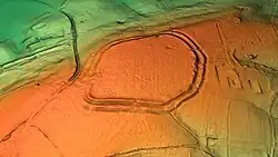 It is thought that the site was occupied as early as the 6th century BC, and probably supported a fluctuating population of up to 300 ancient Britons over several hundred years.[3] Bussock Hill and Bussock Hill House are sited close by on a slightly separate prominence to the south-east.