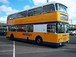 In 1989 and 1991, employee owned Busways standardised on the Scania N113 chassis, on Northern Counties and Alexander RH double-deck bodies,[27] and Alexander PS single-deck bodies.[28] The double deck fleet was also added to with the purchase of Northern Counties-bodied 1987 Leyland Olympians from London Transport's Bexleybus operation. In November 1992, Busways moved into the midibus market, purchasing 20 Alexander Dash bodied Dennis Darts during a period of direct competition with Welcome Passenger Services,[29] although 1993 batches were augmented with Plaxton bodied examples.