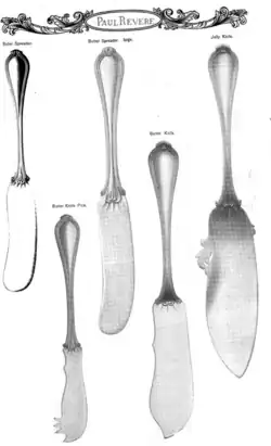 Butter knives (and a jelly knife) by Towle Silversmiths ("Colonial Paul Revere pattern, 1901). Left to right: small butter spreader, butter knife pick, large butter spreader, butter knife, jelly knife[1]