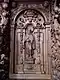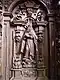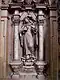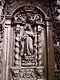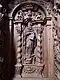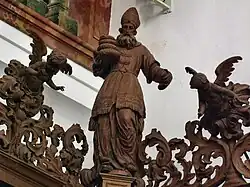 The entrance is flanked by Christ and Mary. Christ is depicted south of the portal, on the epistle side, with the globe in his left hand as Salvator mundi. His right hand is outstretched in blessing. This stall is intended for the prior. On the Gospel side, Mary gathers up her overlong robe with her left hand, while her right hand rests on her chest. The places next to Christ are dedicated to Elijah and Paul of Thebes. The Old Testament prophet Elijah, who is venerated by the Carmelites as the founder of their order, is stepping with his left foot on a severed bearded head. This attribute is related to God's judgment on Mount Carmel, when Elijah had them killed after his victory over the prophets of Baal 1 Kings 18. The place of Paul of Thebes is empty, his statue has been lost, only the inscription on the name cartouche reminds us of him. He was the first hermit and became a role model for the Paulines. The statue of John the Baptist has been lost. He was particularly revered by the hermits of St. John, an order that was confirmed by Pope Gregory XIII in 1575. The name of the Baptist on the cartouche indicates that he took his place next to Mary, followed by Anthony the Great, the father of Western monasticism, easily recognized by the cross of Anthony on his cloak and the little bell in his hands. The Antonites refer to him. They drew attention to him by ringing the bell of St. Anthony when collecting money for their hospitals.[27]