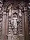 Equally clearly identifiable is Guido of Montpellier, the founder of the Brothers of the Order of the Holy Spirit, dressed in a gown, biretta and cloak. A patriarchal cross with split ends can be seen on the cloak and gown as a sign of the order. He is followed by Dominic of Caleruega, founder of the Dominicans, with a dog as an attribute at his feet. His mother had dreamed that her son was a dog with a torch in his mouth that lit up the whole world.[31] The torch on the statue has been lost. The dorsal field next to Dominic is empty; the cartouche indicates that it is the place of Philippus Benitius, the Prior General of the Servites. In the next niche is the statue of Petrus de Murrone, a hermit who was elected pope in 1294 and resigned his office as Coelestine V after just a few months.[32] As an attribute, he holds the discarded papal mantle on his right arm. He is the founder of the Coelestine Hermits, who were later named after him. Due to the missing inscription, the figure next to Petrus de Murrone can no longer be identified. In the current installation, the place is occupied by Francis of Assisi, the founder of the Franciscan order. He is recognizable by his stigmata. According to the cartouche, the penultimate sculpture depicts John of God, whom the Brothers of Mercy took as their model. His attributes are lost. Teresa of Ávila, the Carmelite reformer, stands at the end of the shortened north side with a flame in front of her chest as a sign of her love of God.