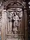 The high stringers stand directly above the seat stringers on the shoulder rings, with two types of alternating heights on the north and south sides. The lower ones are 1.42 meters high and end at the lower edge of the entablature, giving the impression that they are supporting the entablature. The higher ones measure 1.57 meters and extend into the interior of the hollow entablature box. In the middle of the high cheeks, frontally aligned, are herm-like angel figures that merge into openwork carved acanthus scrollwork. Between the high cheeks are the dorsals, the back walls of the individual stalls, with round-arched niches that have an architectural structure. The lowest level is formed by a plinth with a name cartouche. Above the cartouche is another niche crowned by a shell with a putti or acanthus leaf console for the saint's figure, which is placed there. This niche is flanked by supporting elements, mostly columns or pilasters, which carry an entablature with a varied gable zone.[26] The spandrels between the round arch and high cheeks are alternately filled with putti heads or acanthus leaves.