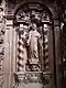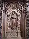 The name cartouche is missing from the next stall and so, according to Friedrich Kobler, it is not possible to prove who was intended to be there.[29] Francis of Paola, the founder of the Pauline Order (Minims), belongs to the 15th/16th century and does not fit between John of Matha and Peter Nolascus, both of whom can be dated to the 12th/13th century, as the figures in the two longitudinal rows are arranged chronologically from west to east. The fact that his tonsure is missing and that he is not girded with a rope over his scapular speaks against the thesis that the figure is the founder of the order. Petrus Nolascus is a co-founder of the Mercedarians and can be clearly identified by the coat of arms of the Kingdom of Aragon on his scapular. Due to the lack of a cartouche, Kobler leaves the occupation of the next niche open. It depicts Birgitta of Sweden, the founder of the Birgitten Order, holding a book in her hands. Beneath her headscarf, the so-called Birgitten crown, which is part of the Birgittines' religious costume, is visible. Next to her stands Kajetan von Thiene, co-founder of the Theatines, dressed in a belted cassock and a cloak with a collar. He is followed by Ignatius of Loyola, the founder of the Jesuits, in a chasuble and with outstretched arms. According to the inscription, Philip Neri, who founded the Order of the Oratorians, is the last in the row that was shortened during the Baroque period. He wears a long cloak over a cassock girded with a cingulum.