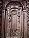 The dominant figure on the west side is that of the Archangel Michael above the entrance portal. It was carved by a different carver than the other cornice figures, appears more ponderous and is more rooted in tradition.[27] The archangel stands on a raised postament structure and towers above the other statues despite the lowering of the portal during the Baroque period. With his right hand, he points to the shield in his left with the words QUIS UT DEUS (Who is like God?), the Latin form of the name Michael. It means that God alone is entitled to rule. On the pedestal, the proper name of God in Hebrew letters, the tetragram, is inscribed on a heart-shaped surface, surrounded by the heads of the four living creatures which, according to the Revelation of John, surround God's throne. They resemble a lion, a bull, a man and an eagle and praise the holiness of God. Their song of praise is written on the banners held by two angels: Sanctus, sanctus, sanctus Dominus Deus Sabaoth. In contrast to Rev 4, the last word is not "omnipotens" but "Sabaoth", thus referring to the Mass chant of the Catholic liturgy. The four seasons are depicted on the frieze zone of the portal, which was originally at the same height as the pews. In the center, an atlant bears the pedestal of the archangel Michael. To his left, flowers and ears of grain, symbols of spring and summer, spill out of two cornucopias; to the right, grapes refer to autumn and a monk warming his hands over a fire refers to winter. The date of completion of the choir stalls is artfully inscribed between the seasons with the number 1691. The door, which is decorated with angel heads, is flanked by two cherubs. In contrast to the raised stalls, the entrance portal stands directly on the stone floor.