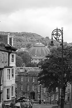 Currey also designed the Grade II listed Buxton Baths, comprising the Natural Mineral Baths to the west of The Crescent and Buxton Thermal Baths to the east, which opened in 1854 on the site of the original Roman baths, together with the 1894 Pump Room opposite. The Thermal Baths, closed in 1963 and at risk of demolition, were restored and converted into a shopping arcade by conservation architects Derek Latham and Company. Architectural artist Brian Clarke contributed to the refurbishment;[35][36] his scheme, designed in 1984 and completed in 1987, was for a landmark modern artwork,[37] a barrel-vaulted modern stained glass ceiling to enclose the former baths[38] — at the time the largest stained glass window in the British Isles — creating an atrial space for what became the Cavendish Arcade.[39][37][40] Visitors could "take the waters" at The Pump Room until 1981. Between 1981 and 1995 the building housed the Buxton Micrarium Exhibition, an interactive display with 50 remote-controlled microscopes.[41] The building was refurbished as part of the National Lottery-funded Buxton Crescent and Thermal Spa re-development. Beside it, added in 1940, is St Ann's Well. In October 2020 Ensana reopened the Crescent as a 5-star spa hotel, after a 17-year refurbishment.[42]