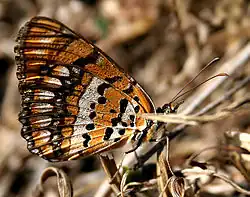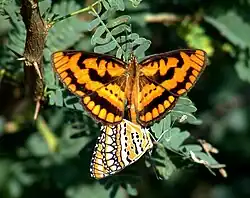 Female similar, with similar markings, but on the upperside the ground colour is paler, the black markings narrower. Forewing: the postdiscal black band nearly complete, interrupted only in interspaces 1 and 4; the terminal black band traversed by a broken white line. Hindwing: no subcostal black patch, instead three series of transverse spots; a postdiscal transverse broad black band bordered inwardly by a series of slender black loops, between these and the postdiscal band a series of spots of the ground colour; the terminal black band traversed as on the forewing by a whitish broken line. Underside similar to that in the male, but the ground colour paler. On the forewing the black markings comparatively narrower, less well-defined; on the hindwing the white on the bands and spots replaced by pale yellow.[4][5]
