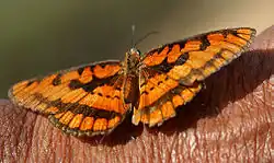 The male has the upperwings of a deep rich orange. The forewing has the costa broadly black until nearly the apex. The cell has three narrow short black bands, the inner and outer not reaching the median vein. An irregular black spot from dorsum to vein 4, continues very narrowly along that vein to meet an oblique irregular band from just beyond the middle of the costa. A postdiscal broad transverse black band from dorsum to vein 4, with the portions of the veins beyond it defined in black. The apex of the wing beyond the broad black edging to the costal border has its upper margin and the terminal portions of the veins defined in black; finally a narrow terminal band. The hindwing has an elongate black sub-costal patch near base, continued posteriorly across the cell by an inner and an outer series of small transverse spots; a complete broad black postdiscal band with the portions of the veins beyond it lined with black, and a narrow black terminal band as on the forewing. Cilia of forewings and hindwings white, alternated with brown.[4]